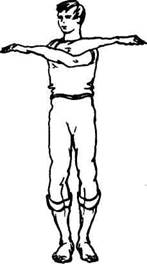 Исходное положение: стоя прямо, руки разведены в стороны. На счет «раз» скрестить прямые руки перед собой на уровне груди до отказа — вдох. Вернуть прямые руки в исходное положение — выдох. Выдох уходит самостоятельно без нашей помощи, «растворяется». Снова на вдохе скрестить руки и снова на выдохе вернуть их в исходное положение. При желании можно руки в процессе возвращения в исходное положение продвинуть дальше назад до сведения лопаток (грудь при этом слегка выдвигается вперед).