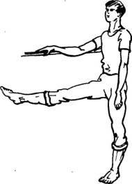 В момент маха нужно слегка присесть на опорной ноге и снова выпрямиться. Должно получиться легкое танцующее приседание, как в упражнении «Кошка?» из основного комплекса нашей гимнастики. Норма—12 раз по 8 вдохов-движений, а при хорошей тренировке — 3 раза по 32 вдоха-движения.
