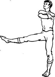 Исходное положение: стоя прямо, руки согнуты в локтях и подняты на уровень плеч, кисти направлены навстречу друг другу. На вдохе резко послать руки навстречу друг другу, как бы обнимая себя за плечи, и одновременно поднять прямую правую ногу до уровня живота, а на левой ноге слегка присесть. Затем на пассивном выдохе правую ногу опустить, левую опорную ногу выпрямить, а руки слегка
