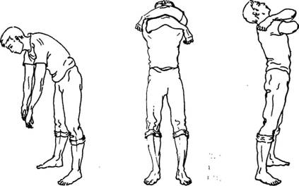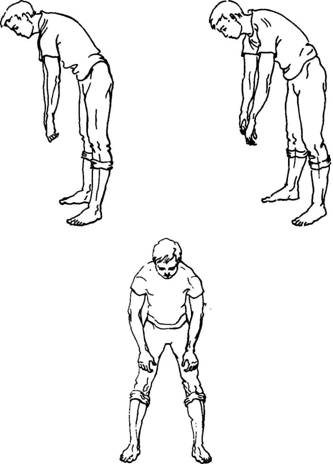 Это упражнение можно делать сидя. Если у вас травмирована спина или очень сильный остеохондроз пояснично-крестцового отдела позвоночника, не делайте прогиба назад в пояснице. Просто делайте встречные движения руками без откидывания головы назад и прогиба в пояснице. Низко кланяться в этом случае тоже нельзя ни в коем случае,— кисти рук должны быть намного выше колен. Постепенно, с каждой неделей тренировки амплитуда движений должна сама увеличиваться, и вы будете прогибаться в пояснице уже без каких-либо неприятных ощущений.