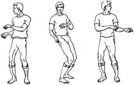 Итак, повернулись вправо, слегка присели — вдох. Колени выпрямились — выдох пассивно уходит при их выпрямлении. Повернулись влево, слегка присели, кистями рук сделали легкое сбрасывающее или хватательное движение— вдох. Сразу же после этого колени выпрямились, воздух ушел абсолютно пассивно при их выпрямлении. Вдох справа, вдох слева.