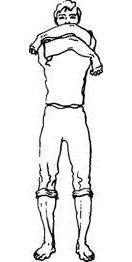 Исходное положение: встаньте прямо. Руки согнуты в локтях и подняты на уровень плеч кистями друг к другу. В момент короткого шумного вдоха носом бросаем руки навстречу друг другу, как бы обнимая себя за плечи. Важно, чтобы руки двигались параллельно, а не крест-накрест. При этом одна рука окажется над другой, причем какая над какой — все равно. Главное — помнить, что в течение всего упражнения положение рук менять не следует.