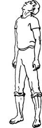 Если упражнение «Обними плечи» у вас уже хорошо отработано и вы делаете его по 32 вдоха-движения без остановки в положении «стоя», можно в момент встречного движения руками слегка откидывать голову назад — делая вдох <<с потолка». Думайте так: локти, сходясь при встречном движении рук, как бы ударяют снизу по подбородку, и голова в это мгновение слегка откидывается назад. Спина при этом должна быть абсолютно прямой, откидывая назад голову, не прогибайтесь в пояснице. В этом случае это упражнение называется «Наклон назад».