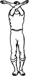 Исходное положение: стоя прямо, руки разведены в стороны. На счет «раз» скрестить прямые руки перед собой на уровне груди до отказа — вдох. Вернуть прямые руки в исходное положение — выдох. Выдох уходит самостоятельно без нашей помощи, «растворяется». Снова на вдохе скрестить руки и снова на выдохе вернуть их в исходное положение. При желании можно руки в процессе возвращения в исходное положение продвинуть дальше назад до сведения лопаток (грудь при этом слегка выдвигается вперед).