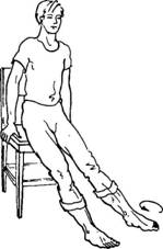 Исходное положение: сидя на стуле, ноги вытянуты, ступни вместе. На счет «раз» тянем носочки от себя (как в балете) и одновременно делаем короткий, резкий, шумный вдох. Затем, без перерыва, на счет «два» тянем носочки на себя (Александра Николаевна говорила: «Не держите ногу утюгом!»). Носочки от себя — вдох, носочки на себя — снова вдох. Раз, два — вдох, вдох. Выдох абсолютно пассивен, он уходит после каждого вдоха через нос или через рот — кому как удобно. Не думайте о выдохе, если будете думать о нем — собьетесь. Думайте только о вдохе.