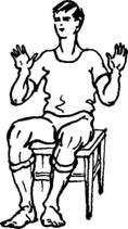 Исходное положение: сидя на жестком стуле или на табурете, ноги чуть уже, чем на ширине плеч. Корпус прямой, спина не напряжена, сидите свободно и легко (но не ссутулившись). Согните руки в локтях (локти вниз) и покажите ладони зрителю - поза "экстрасенса".