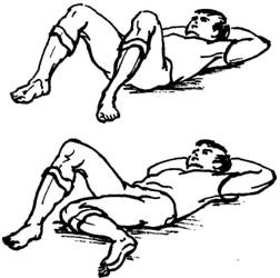 Исходное положение: лежа на спине, ноги согнуты в коленях, колени разведены в стороны (во время выполнения упражнения ноги остаются в таком положении, колени не выпрямлять). Быстро положить правое колено на пол в сторону левой ноги - шумный вдох носом. Возвратить согнутую в колене правую ногу в исходное положение - выдох ушел.