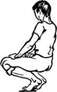 Исходное положение: стоя прямо, ноги чуть уже, чем на ширине плеч, руки висят вдоль туловища. Быстро сесть на корточки, одновременно сделать шумный короткий вдох носом. Спина прямая, ладонями упираемся в колени, пятки в момент приседания слегка оторваны от пола - тяжесть тела на передней половине ступней, колени разведены в стороны.