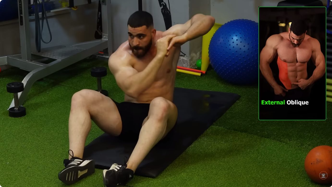 Подтягиваем локоть в противоположной коленке, активируем косые мышцы живота